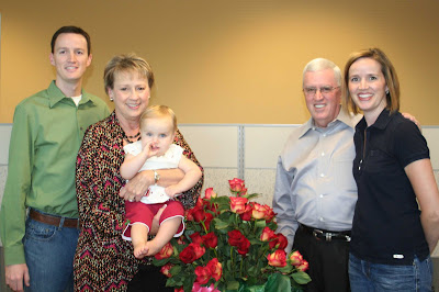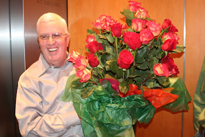 My mom is one funny bunny. Or, should I say that we finally outfoxed the fox?? We’ve been trying for FOUR months, people, to surprise her on her birthday. We didn’t get the party done, but that’s another blog post. BUT. My dad is one amazing guy. He bought her 60 roses. Yep, 60. They were gorgeous. He, Daniel, Clare and I were oh-so-sneaky and surprised her at work on Tuesday. The look on her face, as the MC folks say, was priceless.