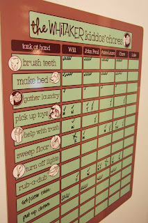 Enter, the best invention ever made. The Chore Chart. I got ours from EM Tanner Designs (no longer in business), but the Organized Parent has a super close second. Yes, yes, you can be crafty and make your own. I was lazy. And this one was super de-duper cute.