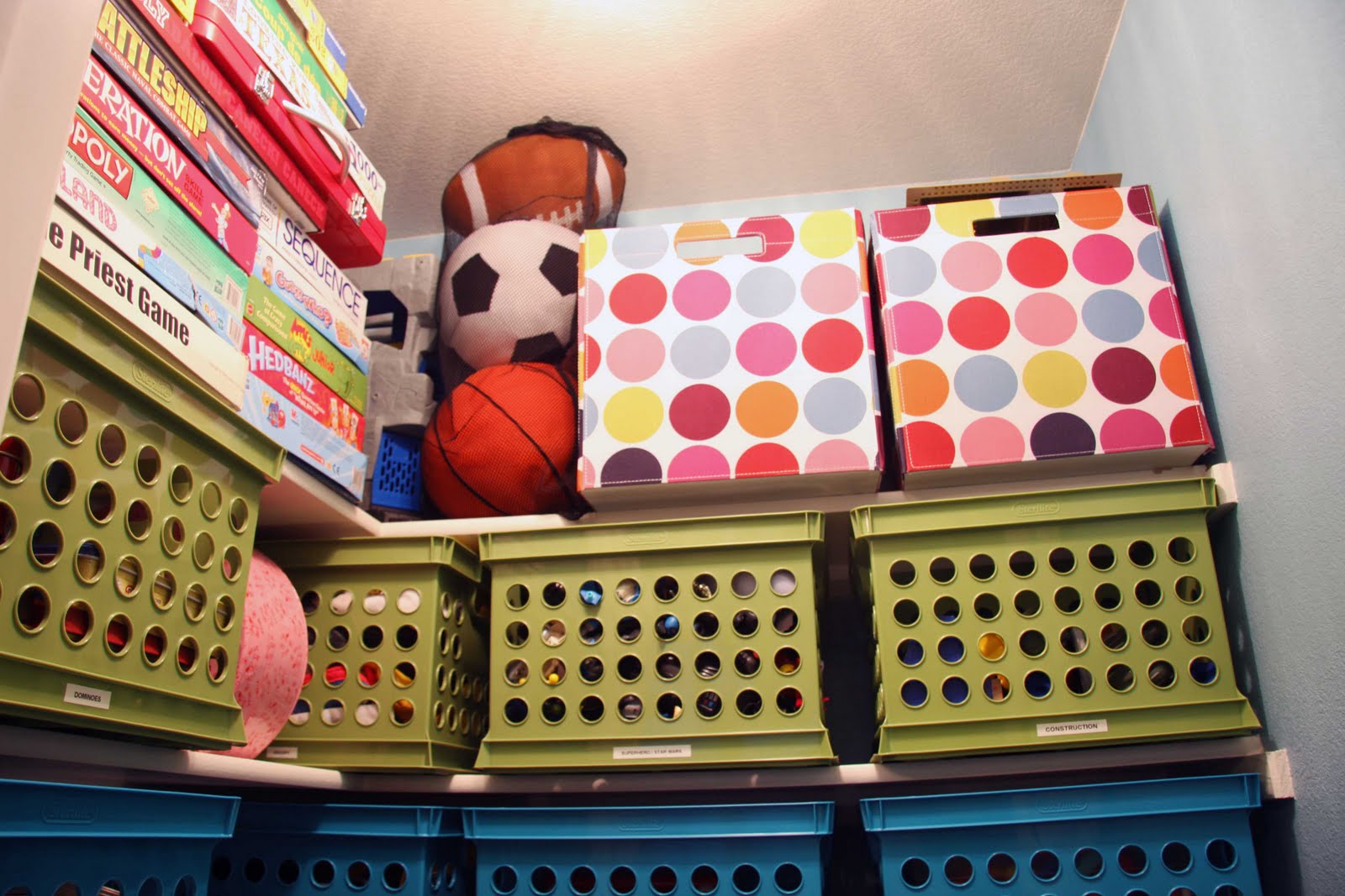 Our gameroom is a large area, but it seemed silly to buy a storage unit for the toys, when we had a perfectly good closet to use! We do have a train table in the room that houses all those toys and we have a media center with baskets that store Wii games, remotes, etc. The bins in the closet are arranged in height by age, so they can reach the toys they can play with, with the exception of board games and legos. With littles in the house, the legos don't stay out all the time. Too dangerous. The same goes for board games. Those are usually a family event anyway. This system works great for us!